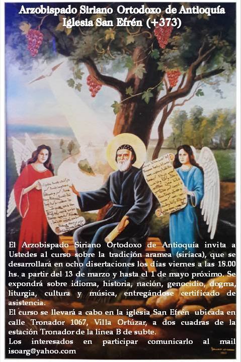 El Arzobispado Siriano Ortodoxo de Antio El Arzobispado Siriano Ortodoxo de Antioquía invita a Ustedes al curso sobre la tradición aramea (siríaca), que se desarrollará en ocho disertaciones los días viernes a las 18.00 hs. a partir del 13 de marzo y hasta el 1 de mayo próximo. Se expondrá sobre idioma, historia, nación, genocidio, dogma, liturgia, cultura y música, entregándose certificado de asistencia.