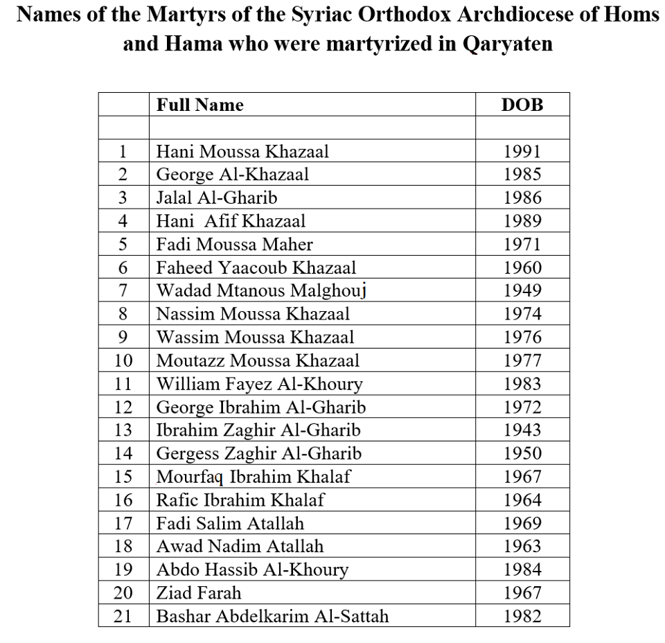 Noticias Previous Next Lista oficial de los nombres de los Már Lista oficial de los nombres de los Mártires de la Archidiócesis Ortodoxa Siríaca de Homs y Hama que martirizados en Qaryatain en Abril 2016 Anterior Siguiente