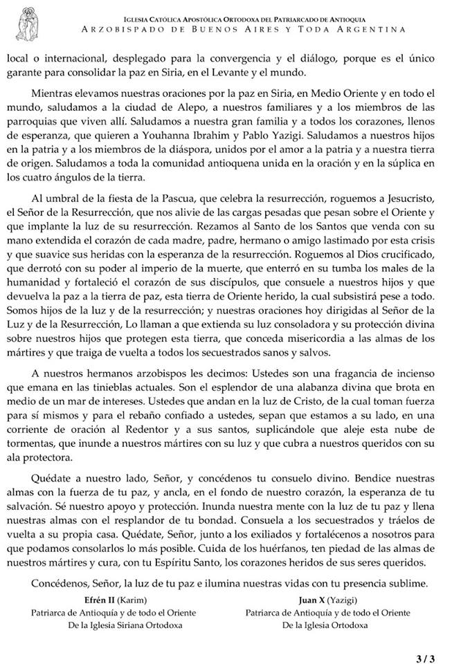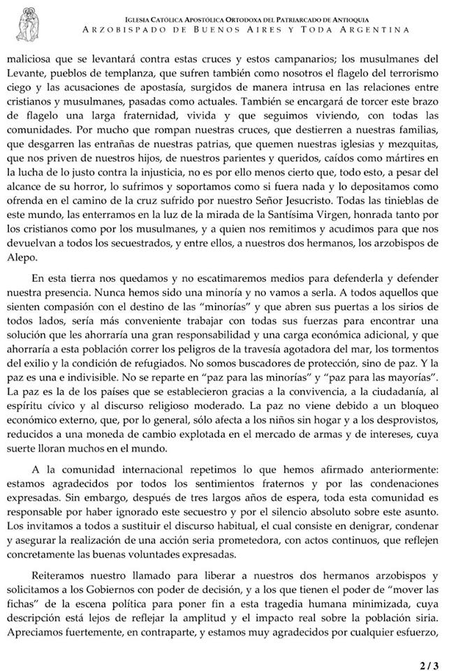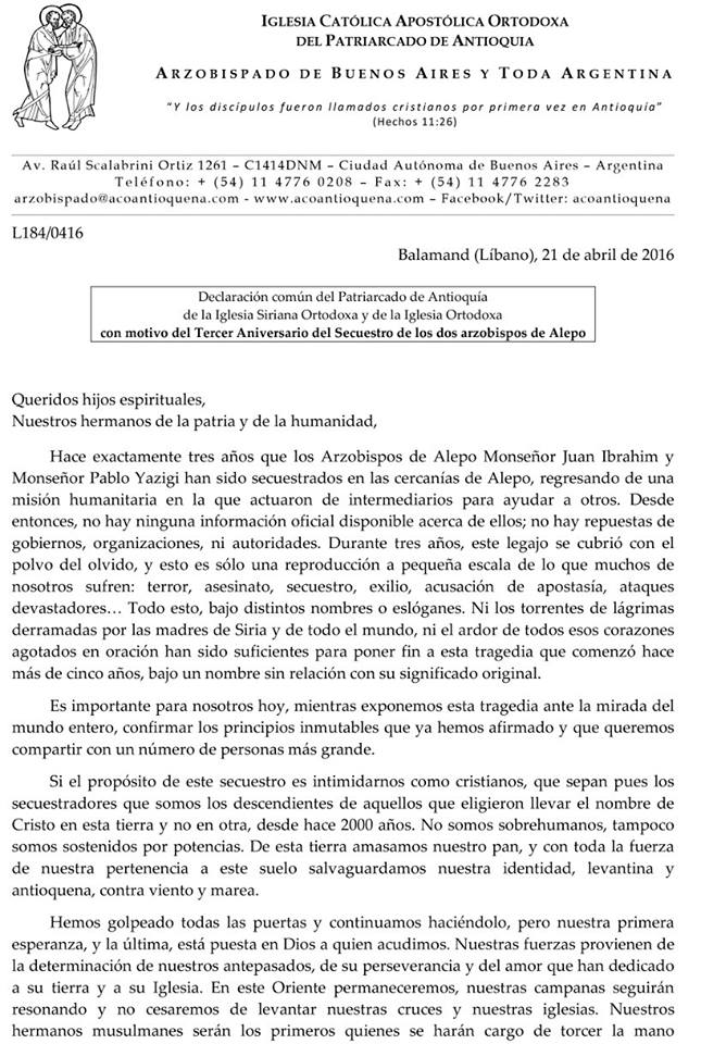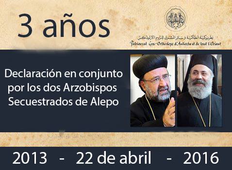 Declaración común del Patriarcado de A Declaración común del Patriarcado de Antioquí­a de la Iglesia Siriana Ortodoxa y de la Iglesia Ortodoxa Griega con motivo del Tercer Aniversario del Secuestro de los dos arzobispos de Alepo
