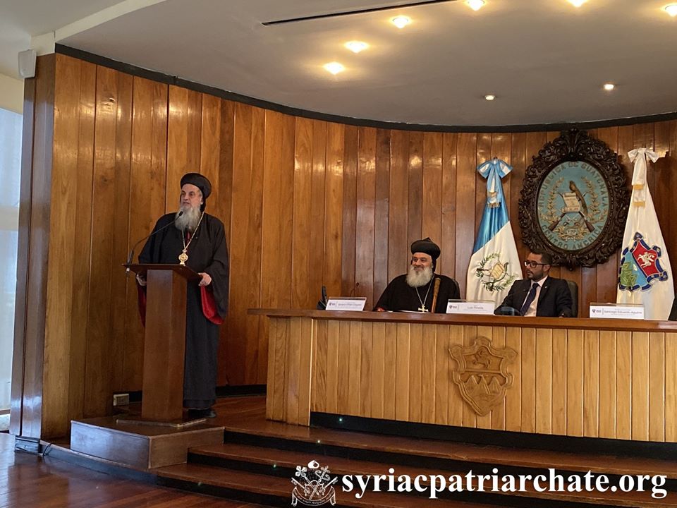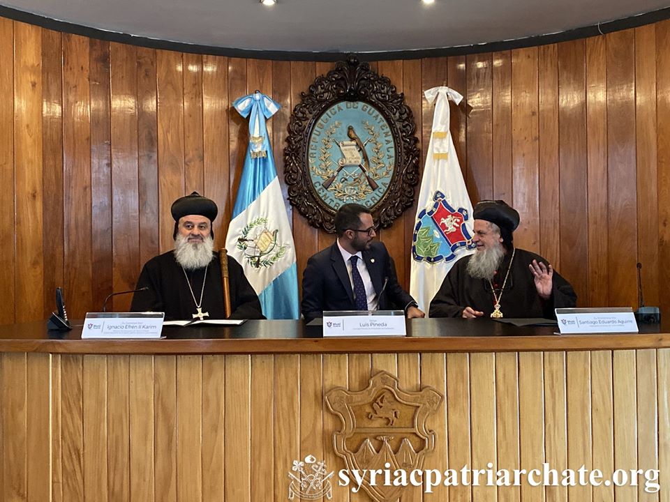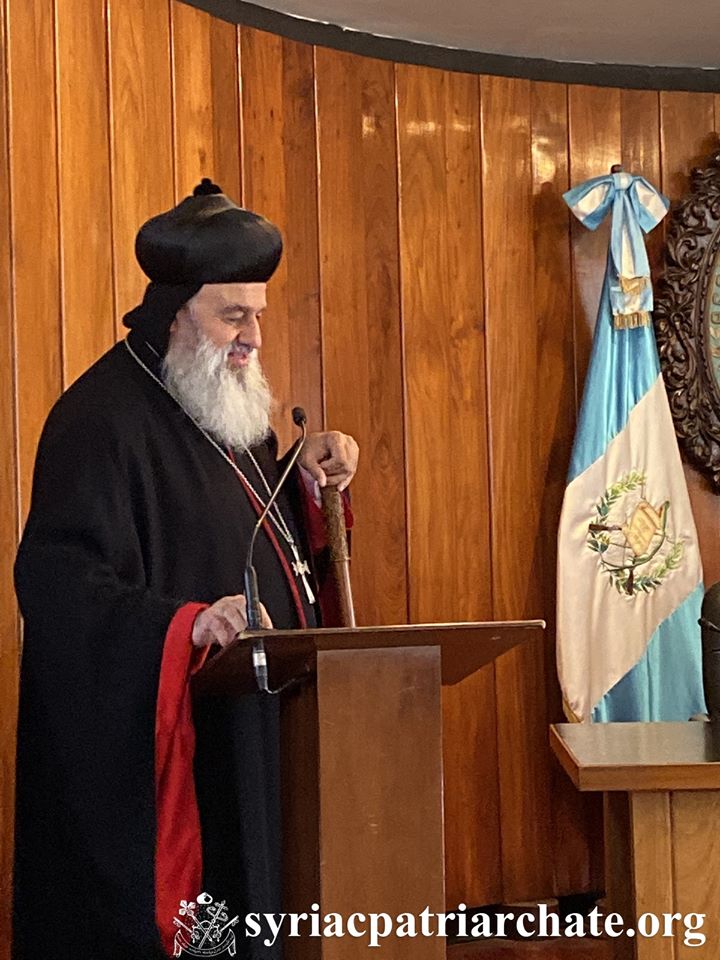 Su Excelencia dio la bienvenida a Su Santidad "en su casa" y lo declaró como el invitado de honor de la Ciudad de Guatemala. Expresó su alegría de ser "honrado por la visita del pontífice de la iglesia más antigua que aún continúa usando el lenguaje de Cristo". También expresó la solidaridad de la gente de su ciudad con el pueblo de Siria que está pasando por tiempos difíciles. Su Eminencia Mor Yacoub Eduardo saludó a Su Excelencia y le agradeció su papel en la promoción del progreso y el desarrollo en la ciudad. En su discurso, Su Santidad agradeció al Vice Alcalde por el amor y el honor mostrado por la gente de la Ciudad de Guatemala. Dijo que, aunque venimos de diferentes países con diferentes culturas, estamos unidos por características similares de nuestras grandes civilizaciones, a saber, las civilizaciones maya y mesopotámica. Agregó que el sufrimiento por causas nobles y por defender los valores nobles también ha sido una característica unificadora de ambas civilizaciones. Habló sobre el objetivo común de luchar contra la injusticia y trabajar juntos para promover la paz. Expresó que está orgulloso de los fieles en Guatemala que son elogiados por su fe y su firme apego a la Iglesia de Antioquía. Concluyó diciendo que tenemos la responsabilidad de compartir la cultura del amor y la tolerancia con todos