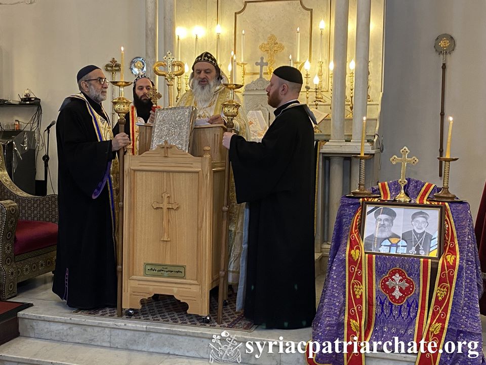 Durante el Santo Qurobo, Su Santidad ofreció oraciones y el servicio de los sacerdotes difuntos (teshmeshto d’kohne) por la conmemoración de un año del fallecimiento del difunto Mor Philoxenus Matta Chamoun y Mor Timotheos Aphrem Aboudi, de bendita memoria.