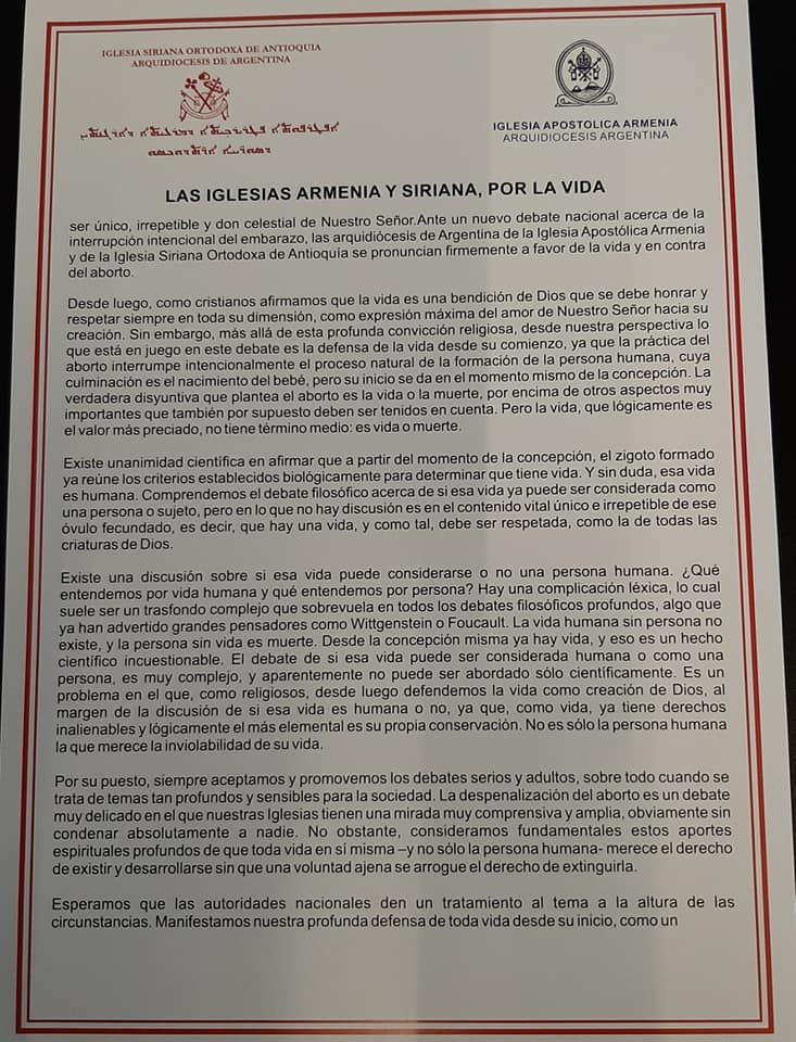 En la visita, Mons. Crisóstomo entregó una carta a Su Excelencia Canciller y Ministro de relaciones Exteriores y Culto de la Nación Ing. Felipe Carlos Solá en nombre de las Iglesias Siriana Ortodoxa de Antioquía y La Iglesia Armenia Apostólica Ortodoxa a favor de la vida, rechazando cualquier ley que apruebe la muerte de un ser humano.