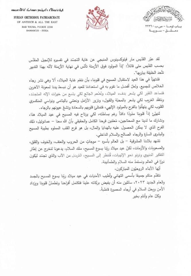 نتقدّم منكم جميعًا بأسمى التهاني وأطيب الأمنيات في عيد ميلاد ربّنا يسوع المسيح بالجسد والعام الجديد 2023، سائلين منه أن يفيض بركاته علينا فتكتمل أفراحنا وتطمئنّ قلوبنا ويزداد الأمن ويحلّ السلام في أرجاء المعمورة قاطبةً.