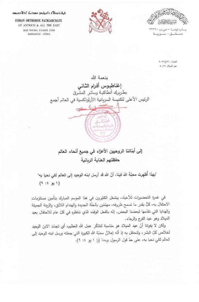 ننشر أدناه رسالة عيد الميلاد لقداسة سيدنا البطريرك مار إغناطيوس أفرام الثاني: