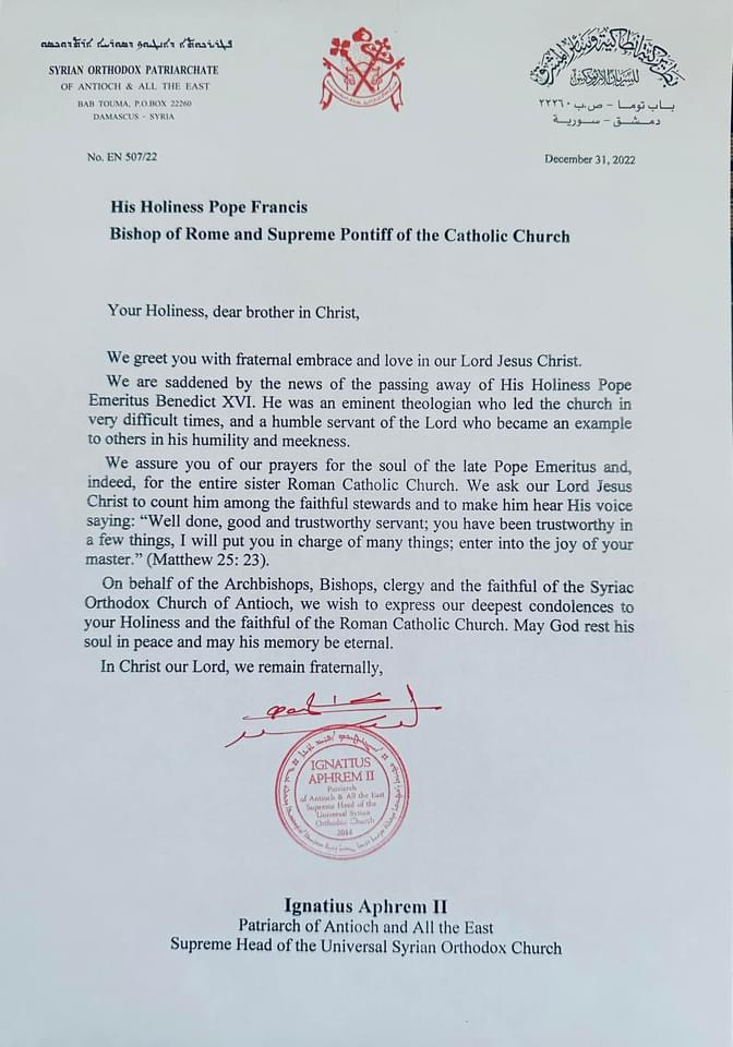 En nombre de los arzobispos, obispos, clérigos y fieles de la Iglesia Ortodoxa Siria de Antioquía, deseamos expresar nuestro más sentido pésame a Su Santidad y a los fieles de la Iglesia Católica Romana. Que Dios descanse en paz su alma y que su memoria sea eterna.