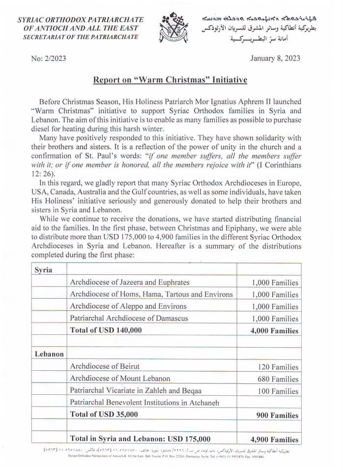 Antes de la temporada navideña, Su Santidad el Patriarca Mor Ignacio Efrén II lanzó la iniciativa "Navidad cálida" para apoyar a las familias Sirianas Ortodoxas en Siria y el Líbano. El objetivo de esta iniciativa es que el mayor número posible de familias pueda adquirir gasoil para calefacción durante este duro invierno.