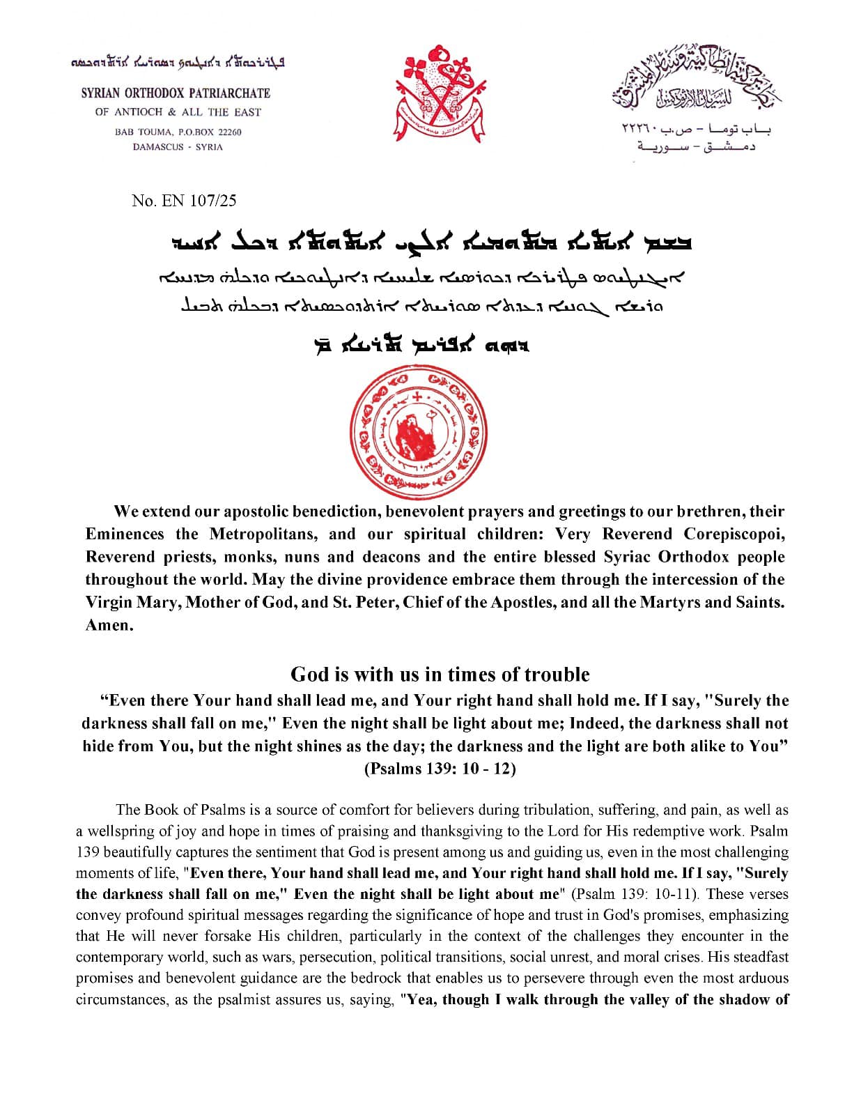 Publicado en nuestro Patriarcado en Damasco, Siria, el veintiséis de febrero de 2025, que es el undécimo año de nuestro Patriarcado.