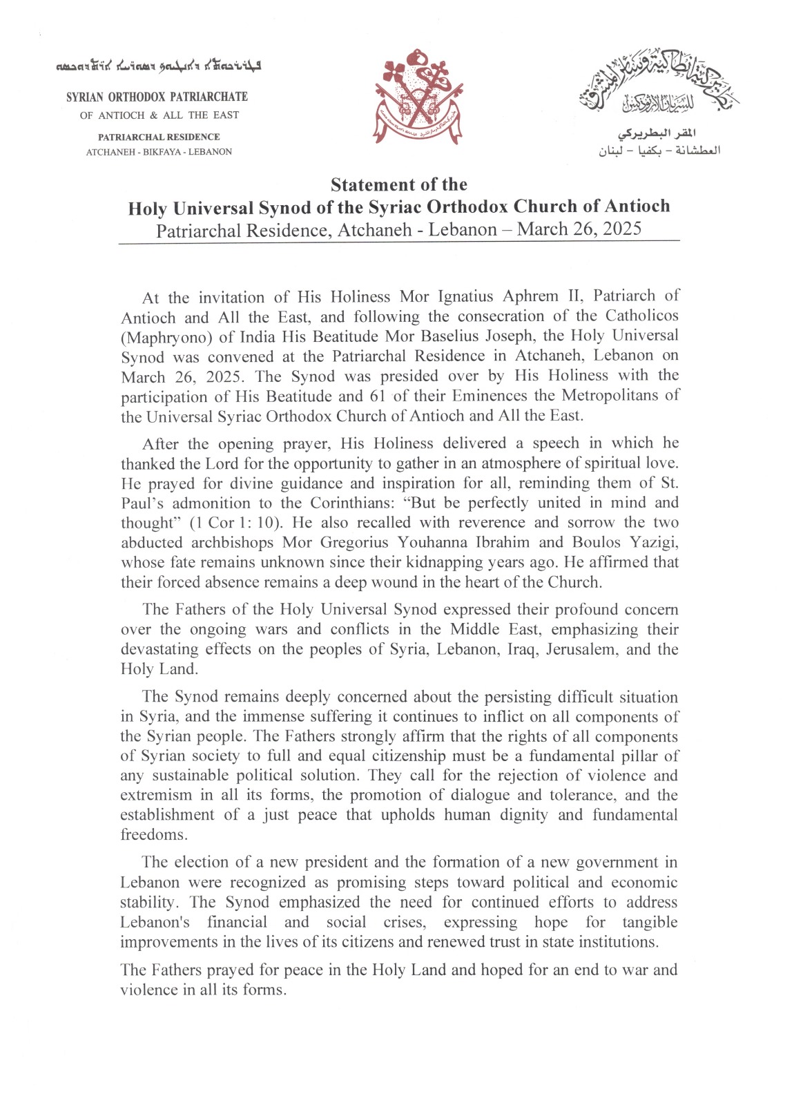 A invitación de Su Santidad Mor Ignacio Efrén (Aphrem )II, Patriarca de Antioquía y todo el Oriente, y tras la consagración del Catholicos (Maphryono) de la India, Su Beatitud Mor Baselius Joseph, el Santo Sínodo Universal se reunió en la Residencia Patriarcal en Atchaneh, Líbano, el 26 de marzo de 2025. El Sínodo estuvo presidido por Su Santidad con la participación de Su Beatitud y 61 de sus Eminencias los Arzobispos Metropolitanos de la Iglesia Siriana Ortodoxa Universal de Antioquía.