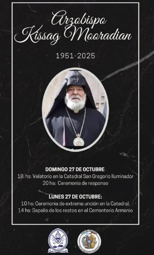 Con esperanza en el Señor Resucitado Jesucristo falleció en la Paz de Dios Su Eminencia Monseñor Kissak Mouradian Arzobispo de la Iglesia Ortodoxa Apostólica Armenia en Argentina y Chile, el lunes 27 de Octubre (ayer) se celebró la Santa Divina Liturgia , encabezada por el Obispo Primado de la diócesis, Monseñor Dr. Arén Shaheenian, en cuyo transcurso tuvo lugar la ceremonia de extremaunción. El Arzobispo Crisóstomo participó en la celebración, ofreciendo las sinceras condolencias a Su Eminencia Monseñor Aren y la Iglesia Armenia , y que su memoria sea eterna.
