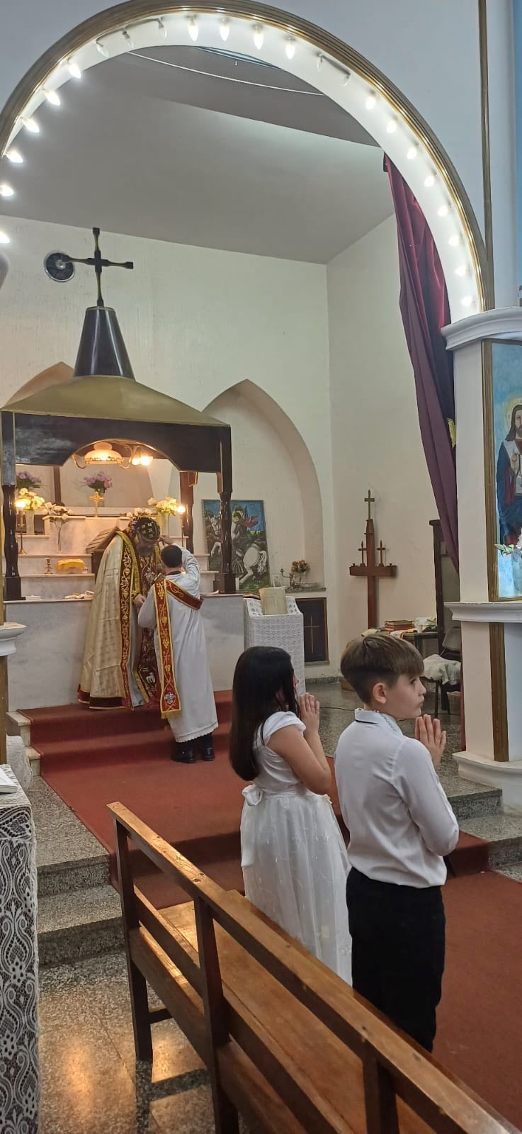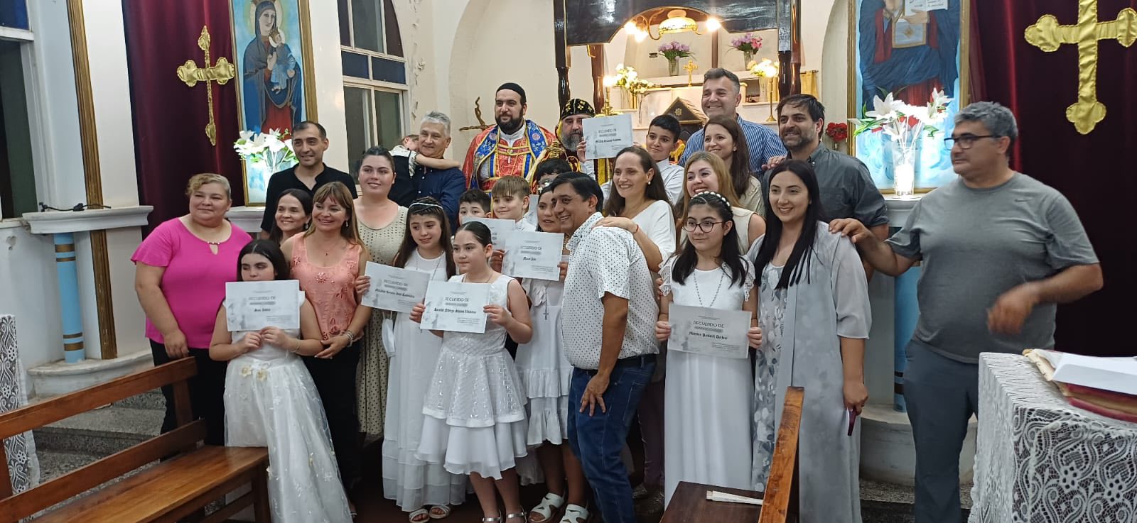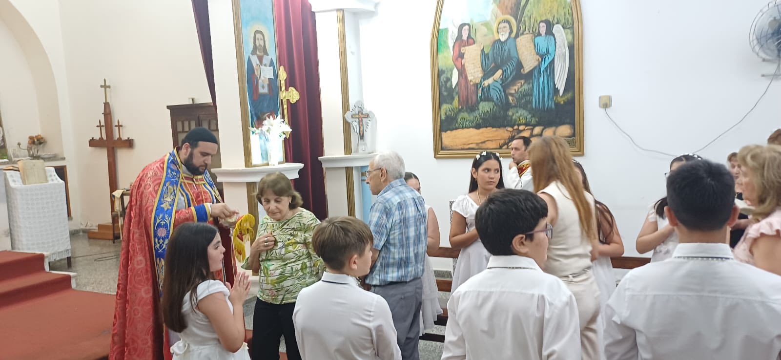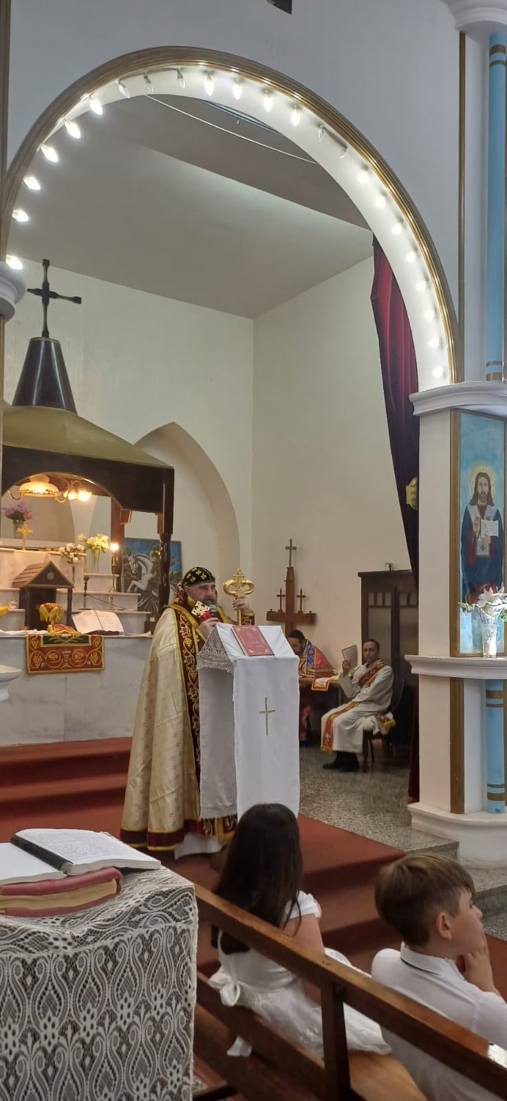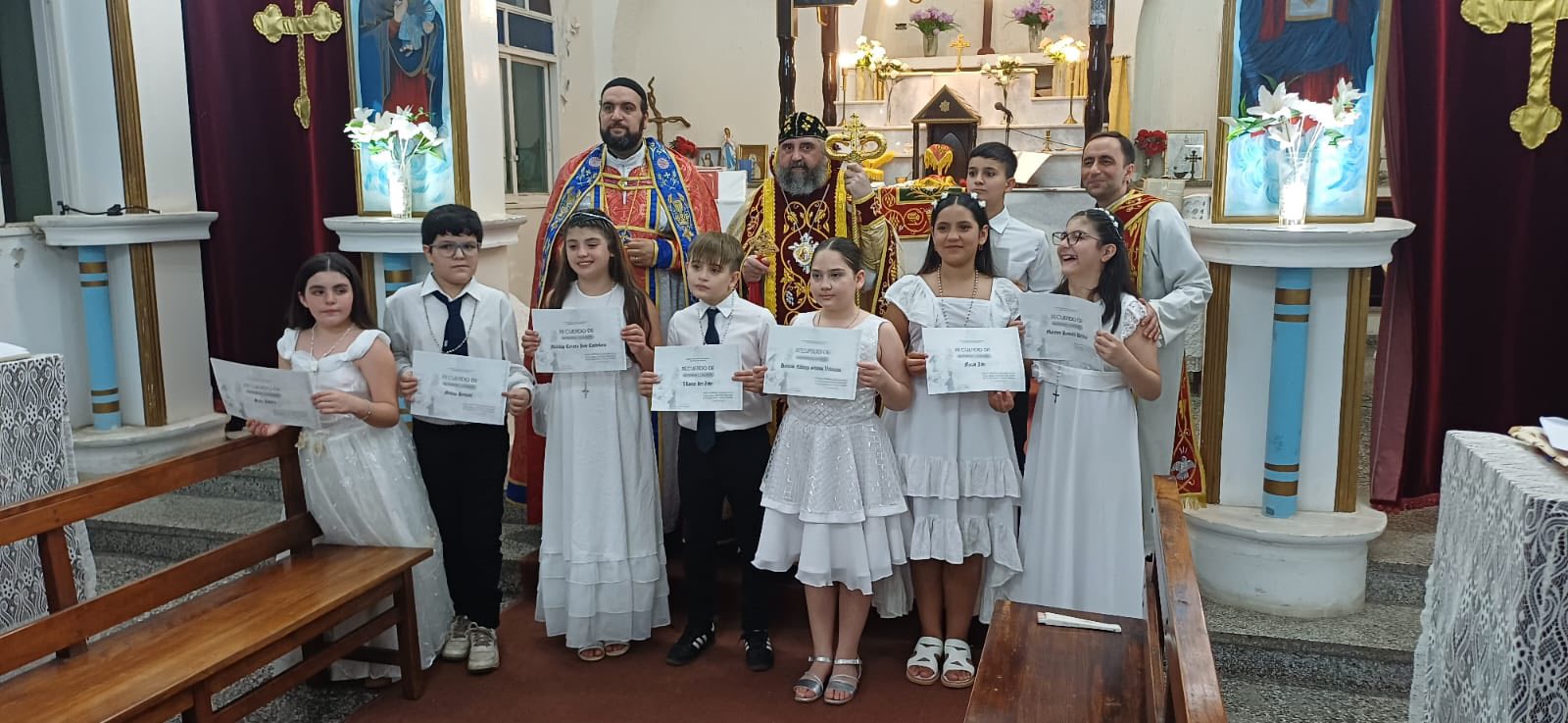 Durante la Misa, un grupo de niños recibieron la Santa Comunión en una ceremonia brillante, llena de alegría y dedicación a la Disciplina de la Santa Iglesia. También, con autorización de Su Santidad el Patriarca Moran Mor Ignacio Efrén II, Mons. Crisóstomo condecoró al Padre Jorge con la Santa Cruz deseándole un bendecido servicio sacerdotal con humildad y éxito.