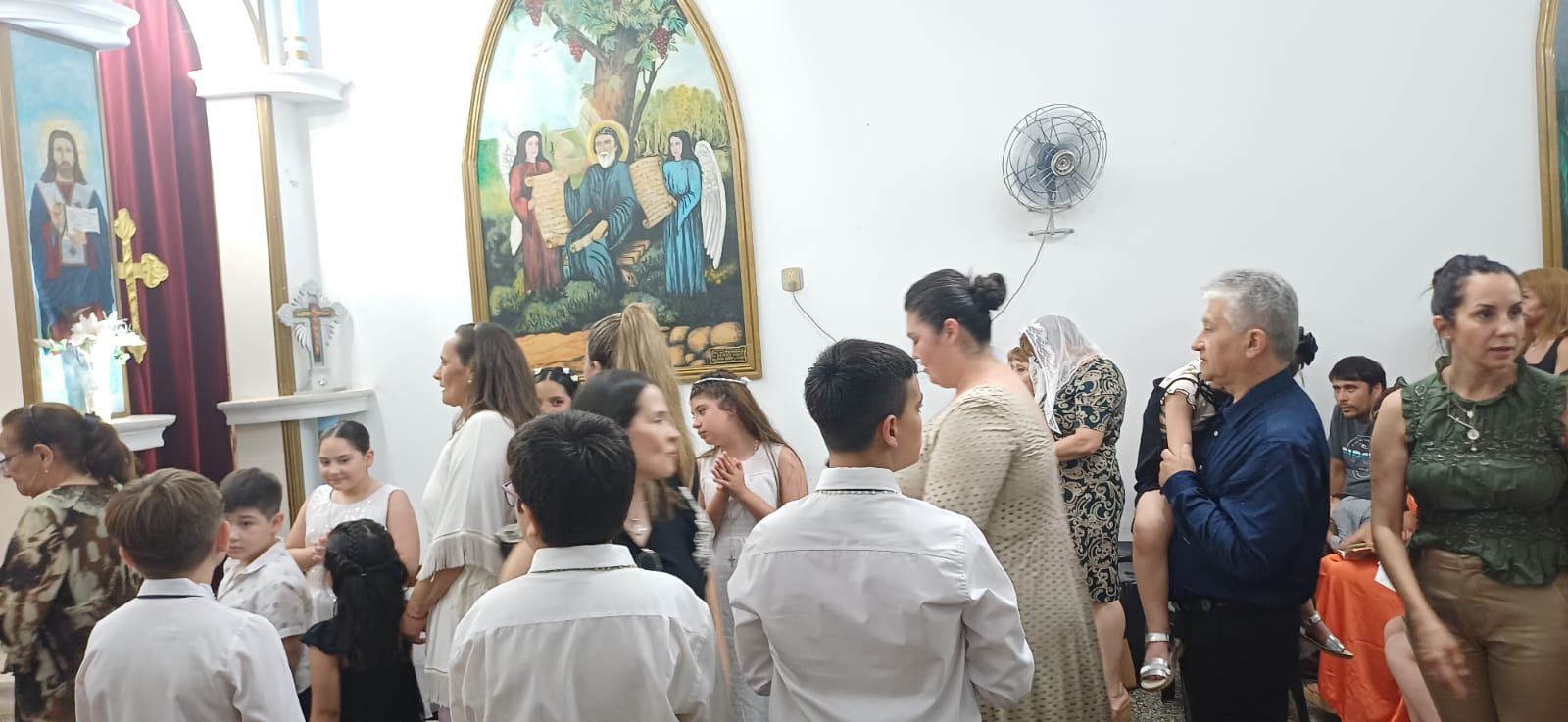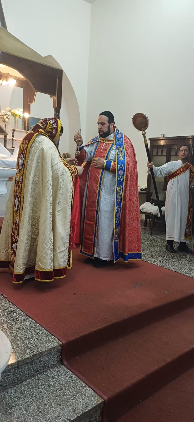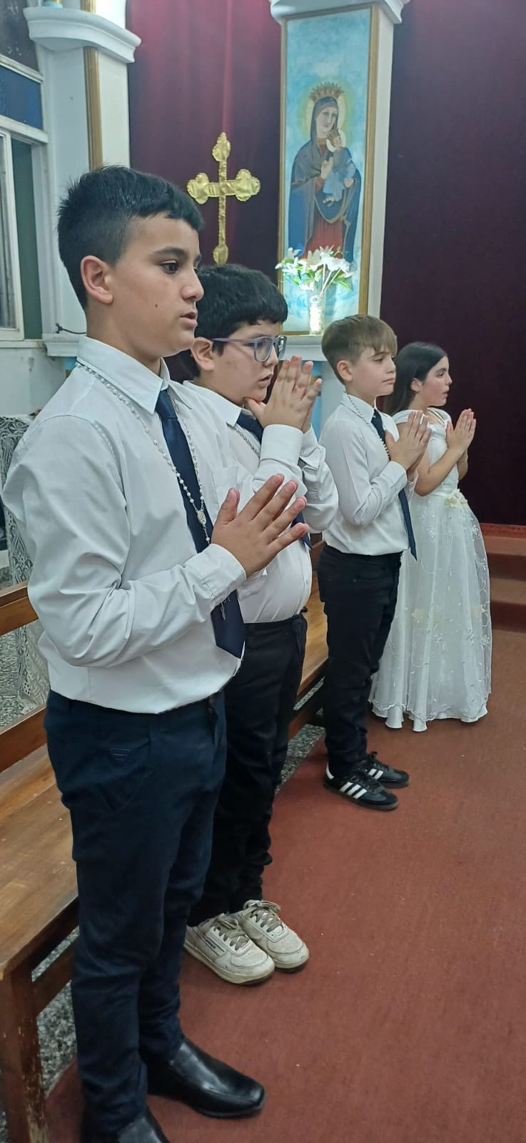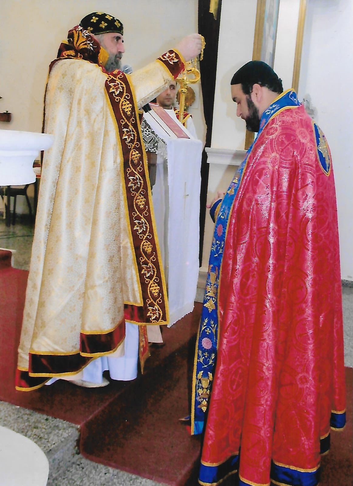 Durante la Misa, un grupo de niños recibieron la Santa Comunión en una ceremonia brillante, llena de alegría y dedicación a la Disciplina de la Santa Iglesia. También, con autorización de Su Santidad el Patriarca Moran Mor Ignacio Efrén II, Mons. Crisóstomo condecoró al Padre Jorge con la Santa Cruz deseándole un bendecido servicio sacerdotal con humildad y éxito.
