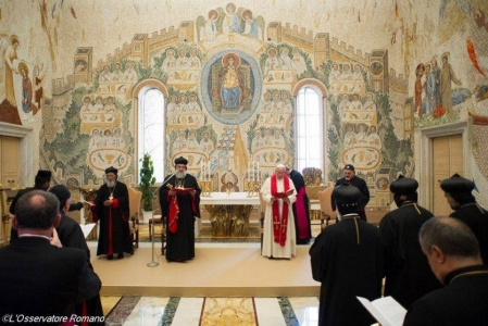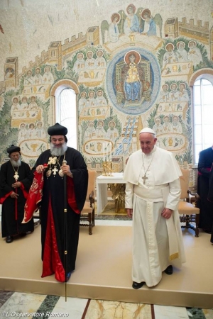 S.S. el Papa Francisco recibió el viern S.S. el Papa Francisco recibió el viernes 19 en el Vaticano a S.S. el Patriarca Siriano Ortodoxo de Antioquia, Mor Ignacio Efrén II, a quien le recordó que la Iglesia Siriana "ha sido siempre una Iglesia de mártires desde el inicio hasta ahora¨, por lo que rezaron juntos por las víctimas de ¨la feroz violencia y por todas las situaciones de guerra en el mundo¨. Instó a que, en estos momentos de “dura prueba y dolorâ€, se estrechen los lazos de unión entre católicos y Sirianos Ortodoxos para que se pueda llegar ¨a la pertenencia a una única Iglesia¨. Además aseguró que "la sangre de los mártires es semilla de unión para la Iglesia".