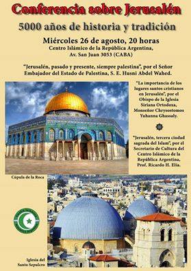En ambiente de fraternidad y amistad, el En ambiente de fraternidad y amistad, el 26 de Agosto, el Centro Islámico de Buenos Aires invitó a una conferencia sobre “Jerusalén 5000 años de historia y tradición’’. En la conferencia, el vicepresidente del CIRA, Sr Anibal Bakir, dio la bienvenida a todos los presentes. Hicieron uso de la palabra el secretario de cultura del Centro Islámico, Profesor Ricardo H. Elia, sobre “Jerusalén como ciudad Sagrada del Islamâ€, el Arzobispo Mons. Crisóstomo sobre “la presencia Cristiana en Jerusalénâ€, y el Señor Embajador del Estado de Palestina, Su Excelencia Husni Abdel Wahed, sobre “la situación de Jerusalén hoyâ€.