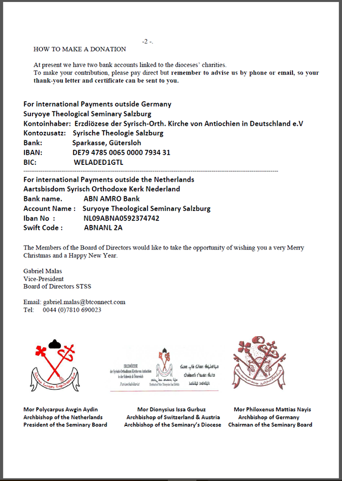 Este es el primer Seminario establecido en Europa, con nivel universitario. Todo el clero Siriano, profesores y miembros de la Iglesia, tienen así la oportunidad de llevar a cabo su educación teológica de acuerdo a nuestra tradición Siríaca. Los miembros de la Junta ofrecen la oportunidad de convertirse en miembro fundador del Seminario, sin embargo, sólo está disponible para un período limitado de tiempo.
