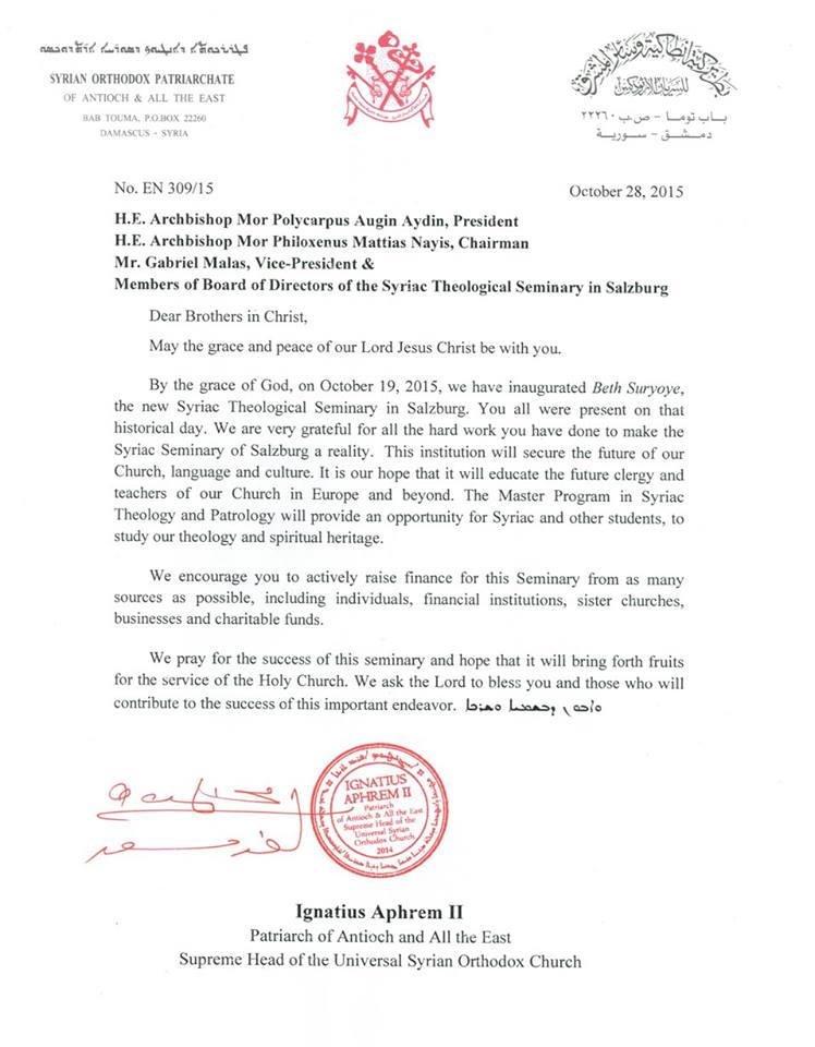 En octubre de 2015, Su Santidad el Patri En octubre de 2015, Su Santidad el Patriarca Mor Ignacio Efrén II Karim inauguró un Seminario Teológico Siriano en Salzburgo.