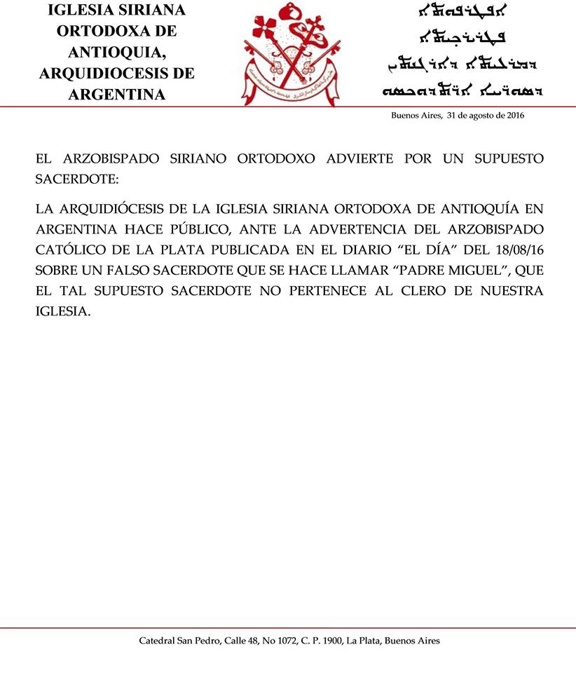 Noticias Previous Next El Arzobispado de la Iglesia Siriana Ort El Arzobispado de la Iglesia Siriana Ortodoxa de Antioquía advierte que, un supuesto sacerdote que se hace llamar “Padre Miguelâ€, no pertenece al clero de nuestra Iglesia. Anterior Siguiente