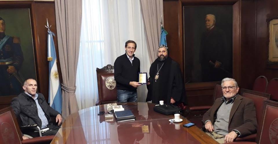 El lunes 30 de julio 2018 nuestro Arzobi El lunes 30 de julio 2018 nuestro Arzobispo Crisóstomo visitó al Intendente de la Ciudad de La Plata, capital de la Provincia de Buenos Aires, Sr Julio Garro, acompañado por el Dr. Raúl Jasale. También estuvo presente el concejal Sr. Julio Irurueta. En la visita Mons. Crisóstomo informó al intendente sobre la historia de Colectividad Siriana Ortodoxa en la Plata desde 1905, la llegada de los primeros Sirianos a esta ciudad, la integración de los fieles en la vida social, también la importancia del nuestra Iglesia Siriana Ortodoxa de Antioquía como guardián de la tradición Cristiana (idioma arameo, rito, liturgia), como iglesia primera fundada en Antioquía en el año 37 por el Apóstol San Pedro, quien primero predicó en Antioquía y después fue a Roma. “Y conversaron todo un año allí con la iglesia, y enseñaron a mucha gente; y los discípulos fueron llamados Cristianos primeramente en Antioquía.†Hechos 11,26. Al finalizar el encuentro, Mons. Crisóstomo entregó un presente (placa con el Padre Nuestro en Arameo) al intendente, quien lo agradeció profundamente