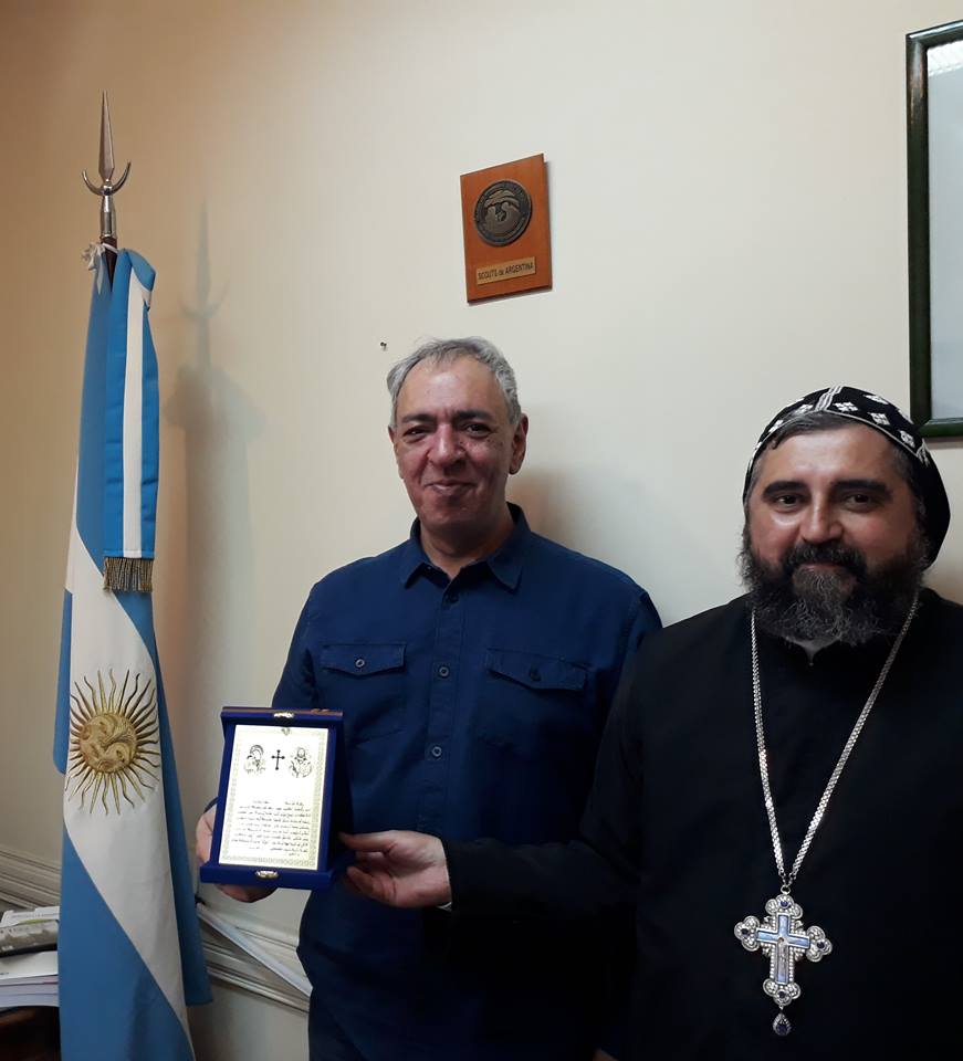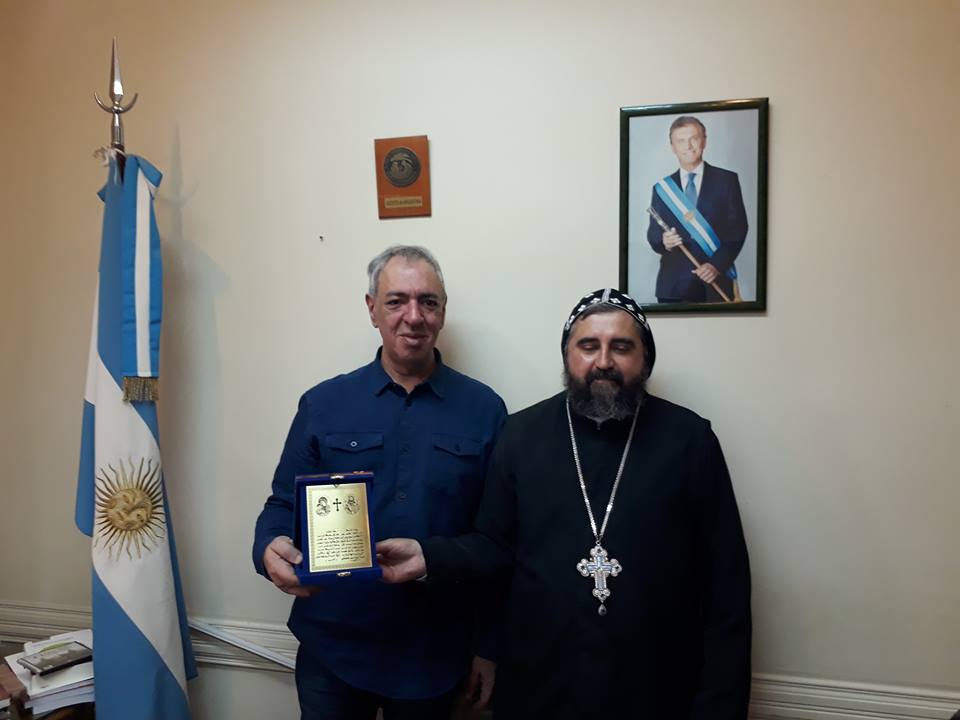 Mons. Crisóstomo habló sobre la condición actual de nuestros pueblos en Siria y Líbano, al finalizar la visita obsequió una placa con Padrenuestro en Arameo al Diputado Abooud quien agradeció profundamente y destacó el rol, la tradición y la Historia de nuestra Iglesia.