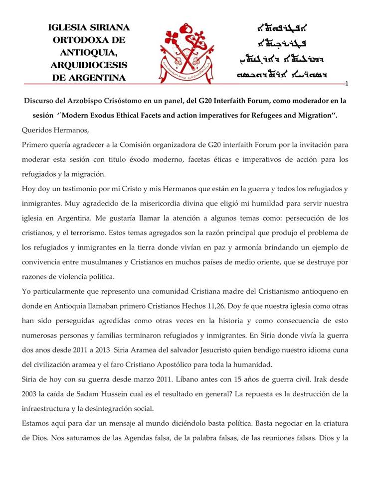 Discurso del Arzobispo Crisóstomo en un Discurso del Arzobispo Crisóstomo en un panel, del G20 Interfaith Forum, como moderador en la sesión ‘´Modern Exodus Ethical Facets and action imperatives for Refugees and Migration’’.