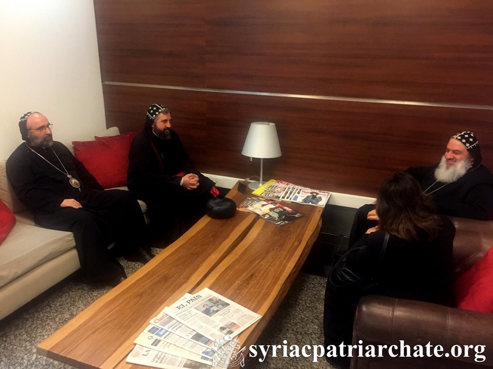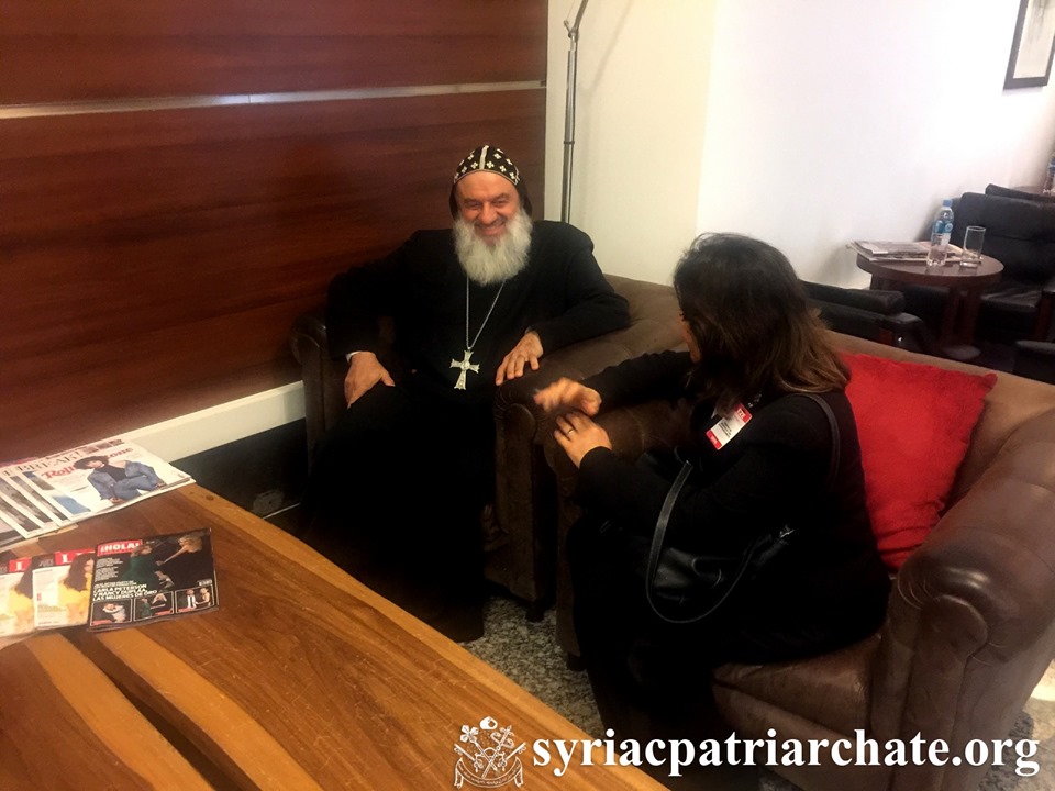 Lo acompañan Su Eminencia Mor Chrysostomos Mikhael Chamoun, Vicario Patriarcal y Director de las Instituciones Patriarcales de Beneficencia en Atchaneh, y el Reverendísimo Raban Joseph Bali, Secretario Patriarcal y Director de la Oficina de Medios.