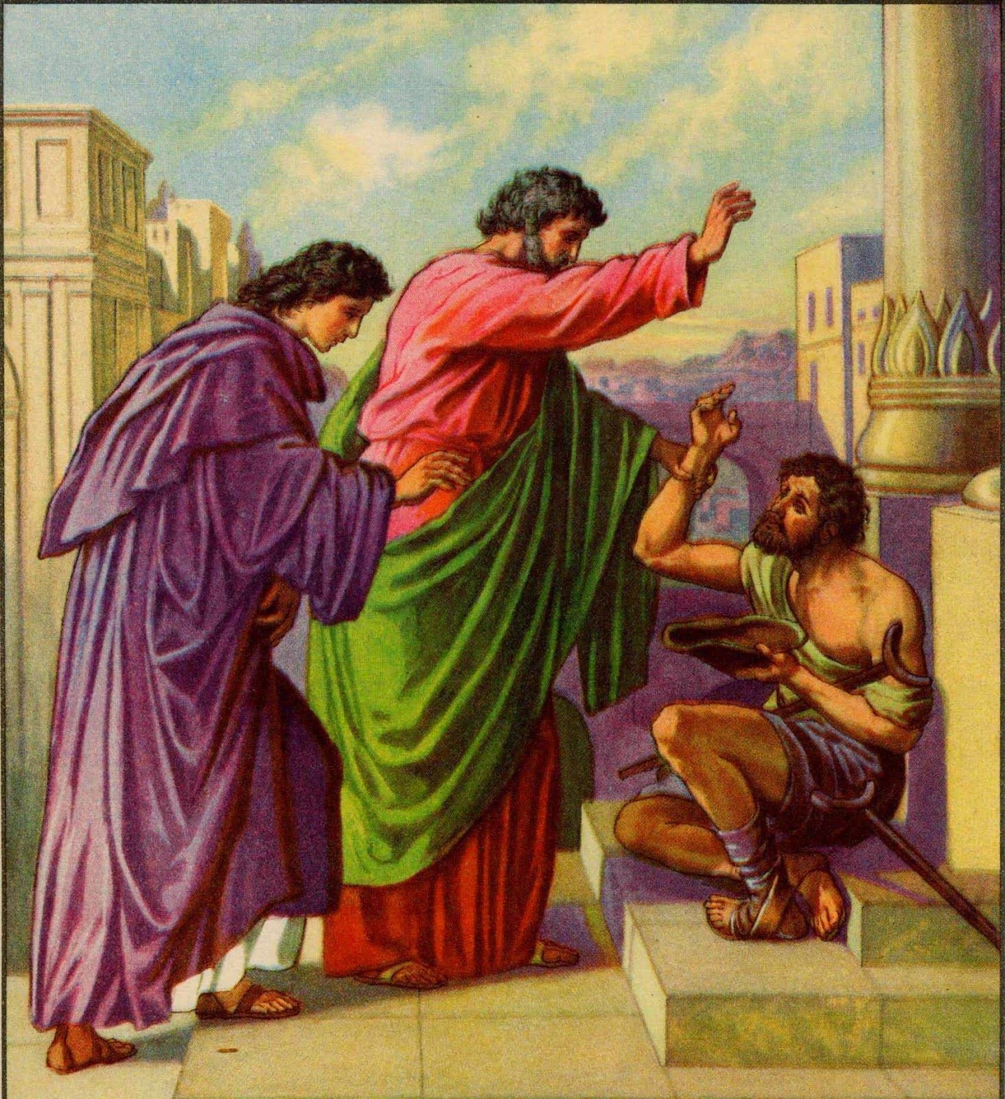 Curación del tullido, el primer milagro de San Pedro y San Juan en el templo después del Pentecostés, sus oraciones sean un refugio para todos nosotros.