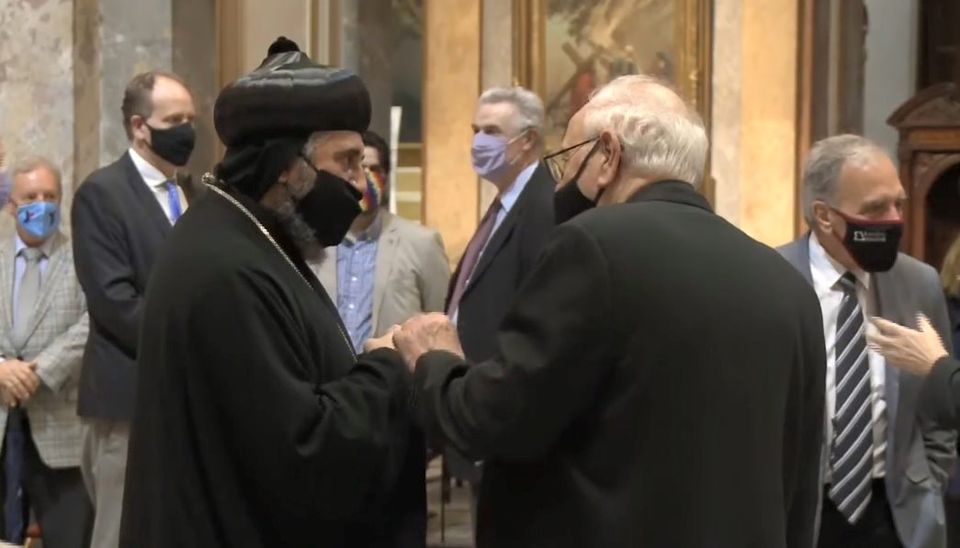 Presentes S.E.R Cardenal Mario Poli Arzobispo de Buenos Aires , S.E.R. Oscar Ojea presidente de la Conferencia Episcopal Argentina, S.E.R. Mons. Carlos Malfa, Su Excelencia Secretario del Culto de la Nación Guillermo Olivieri, representantes de entidades religiosas.