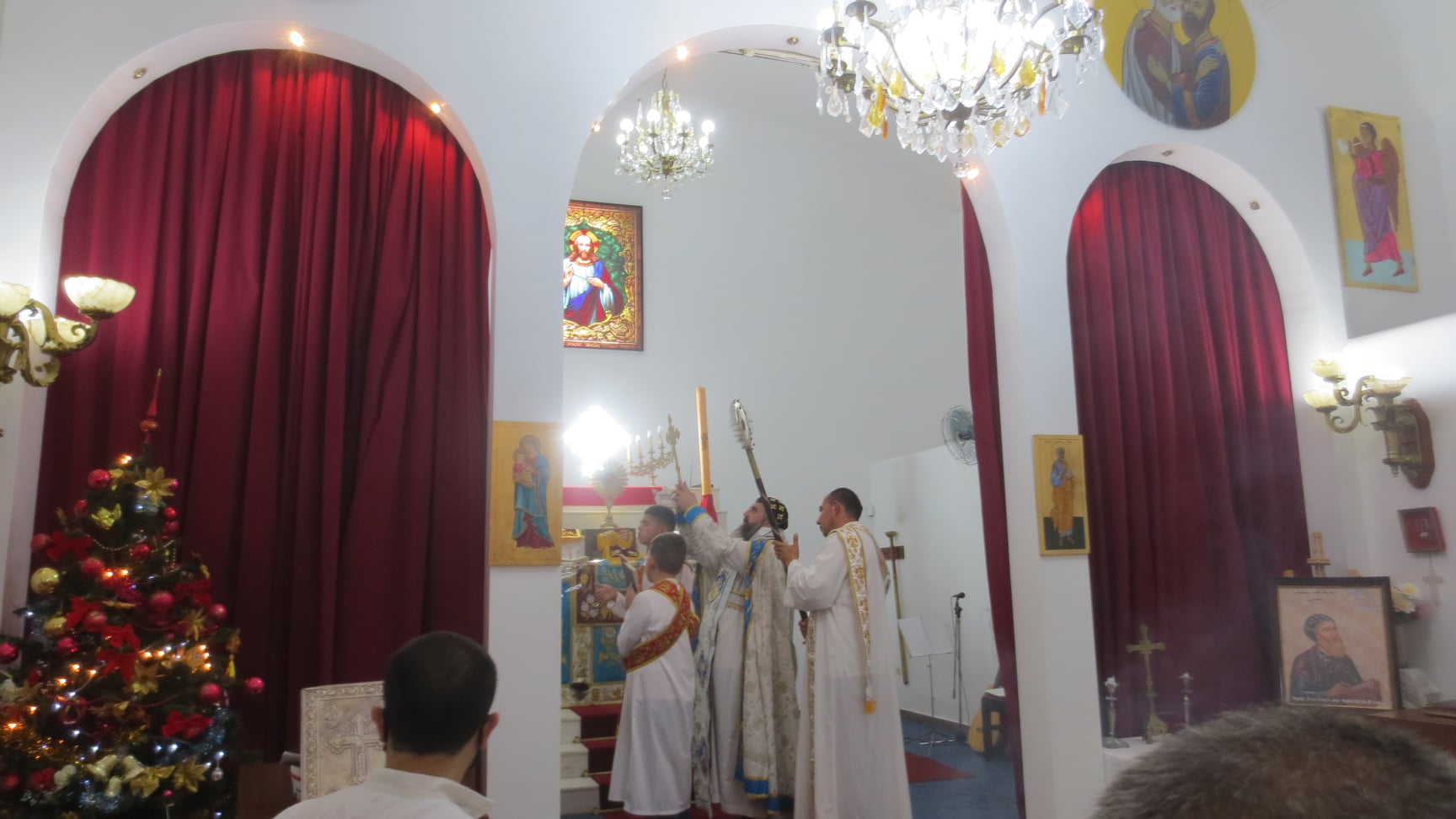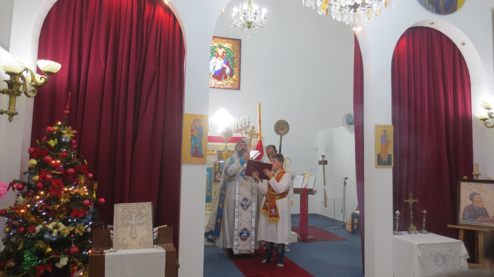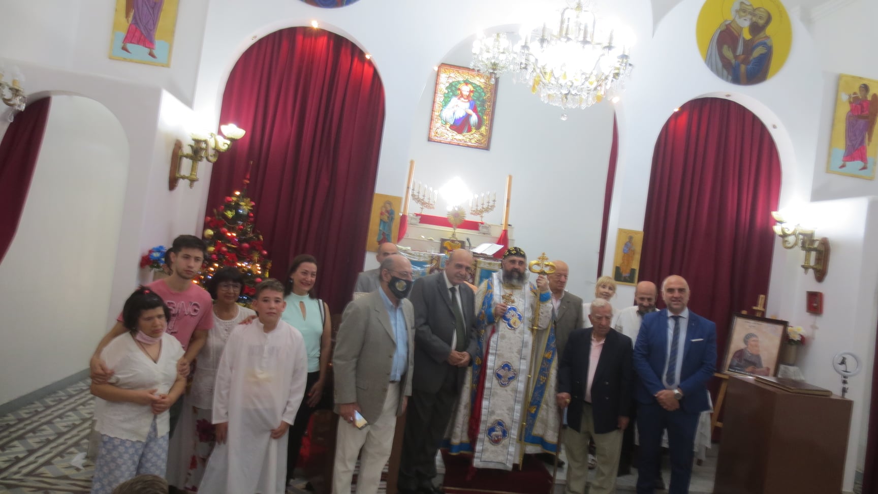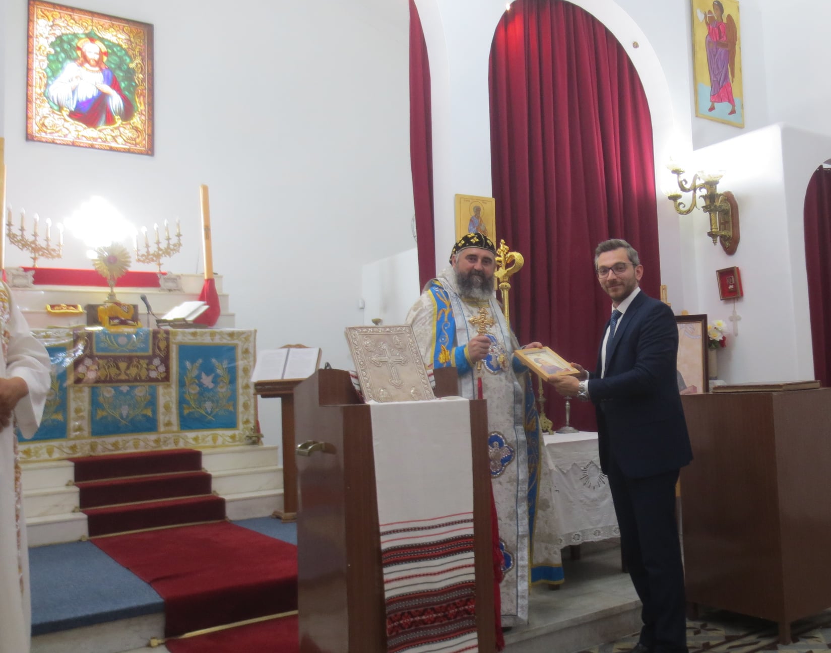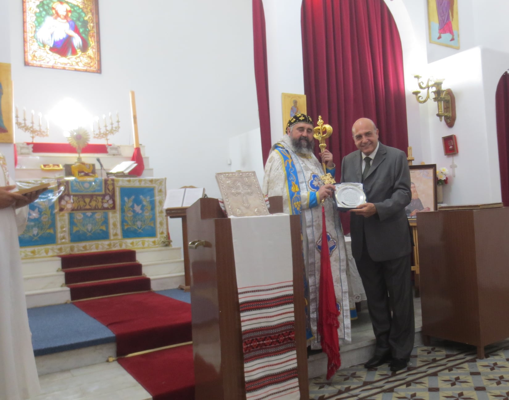 Durante la misa y después del sermón, Mons. Crisóstomo dio la bienvenida a Su Excelencia Embajador de la República Árabe Siria, Dr. Sami Salameh, y al Cónsul, Yazan Ibrahim, y presentó al Embajador un cuadro del “Padre Nuestro” en idioma Arameo y el ícono de San Jacobo de Sarouhg al Cónsul, deseándoles salud y éxito en su gestión diplomática.