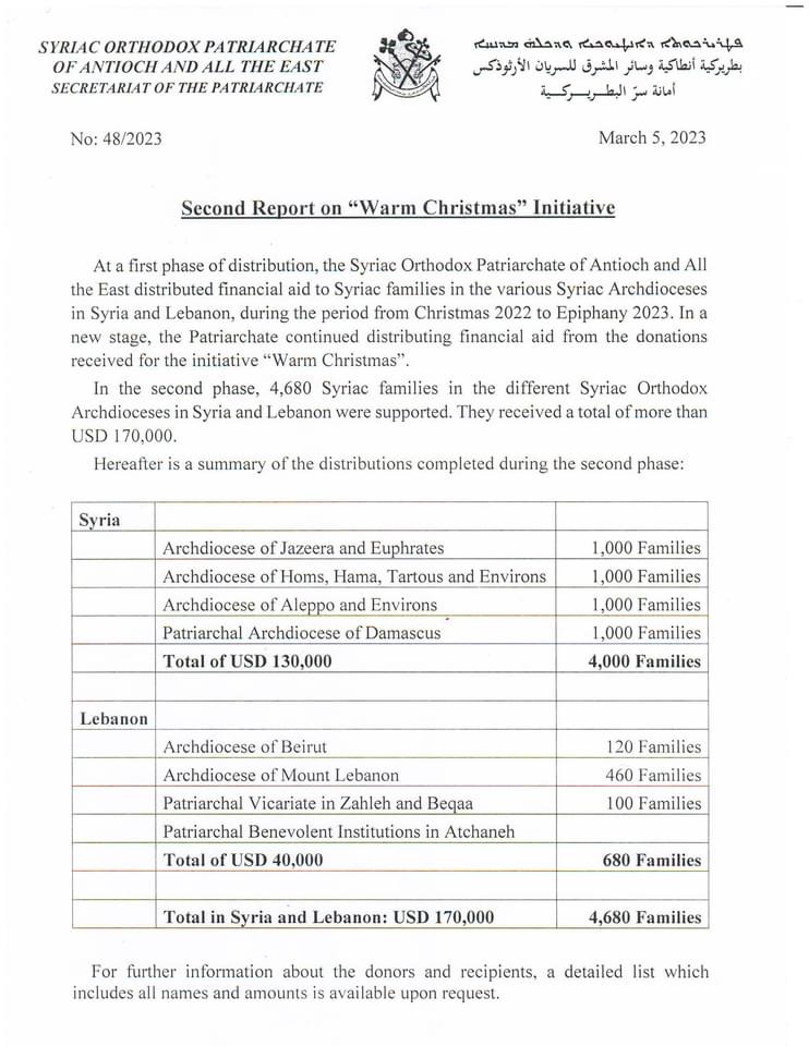 En una primera fase de distribución, el Patriarcado Siriano Ortodoxo de Antioquía y Todo Oriente distribuyó ayuda económica a familias en las distintas Arquidiócesis Sirianas de Siria y Líbano, durante el período de Navidad de 2022 a Epifanía de 2023. En una nueva etapa, el Patriarcado continuó distribuyendo ayudas económicas de las donaciones recibidas para la iniciativa “Navidad Cálida”.