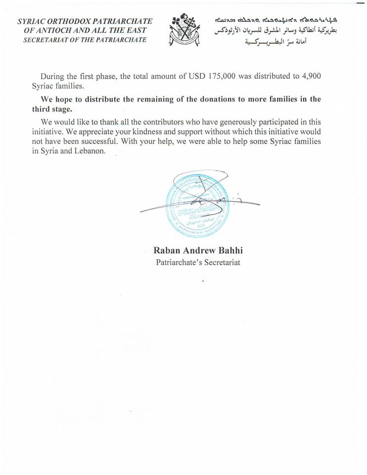 En la segunda fase, se apoyó a 4.680 familias en las diferentes Arquidiócesis Sirianas Ortodoxas de Siria y Líbano. Recibieron un total de más de USD170.000.
