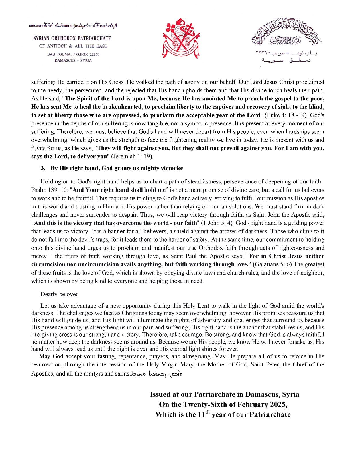 Publicado en nuestro Patriarcado en Damasco, Siria, el veintiséis de febrero de 2025, que es el undécimo año de nuestro Patriarcado.