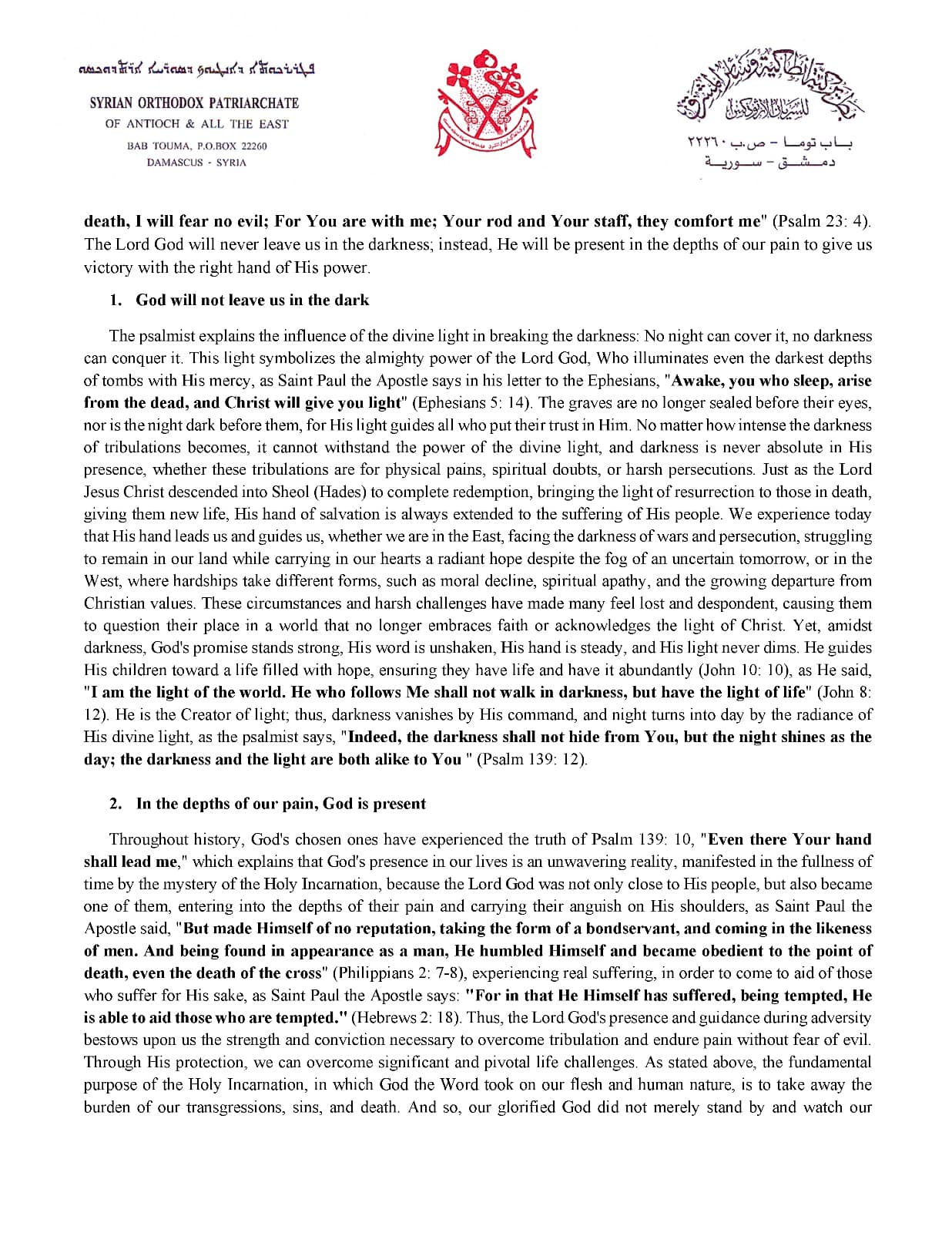 A lo largo de la historia, los elegidos de Dios han experimentado la verdad del Salmo 139,10: «Hasta allí me guiará tu mano», que explica que la presencia de Dios en nuestra vida es una realidad inquebrantable, manifestada en la plenitud de los tiempos por el misterio de la Santa Encarnación, porque el Señor Dios no sólo estuvo cerca de su pueblo, sino que se hizo uno de ellos, entrando en lo más profundo de su dolor y llevando sobre sus hombros su angustia, como dice el Apóstol San Pablo: «Sino que se despojó a sí mismo, tomando forma de siervo, haciéndose semejante a los hombres. Y estando en la condición de hombre, se humilló a sí mismo, haciéndose obediente hasta la muerte, y muerte de cruz» (Flp 2,7-8), experimentando el sufrimiento real, para venir en ayuda de los que sufren por su causa, como dice el Apóstol san Pablo: «Pues cuanto Él mismo padeció siendo tentado, es poderoso para salvar a los que sufren por su causa, como dice el Apóstol San Pablo: "Socorred a los que son tentados" (Hebreos 2:18). Así, la presencia y la guía del Señor Dios durante la adversidad nos otorgan la fuerza y la convicción necesarias para superar la tribulación y soportar el dolor sin temor al mal. Mediante su protección, podemos superar desafíos importantes y fundamentales de la vida. Como se dijo anteriormente, el propósito fundamental de la Santa Encarnación, en la que Dios el Verbo tomó nuestra carne y naturaleza humana, es quitar la carga de nuestras transgresiones, pecados y muerte. Y así, nuestro Dios glorificado no se quedó simplemente de brazos cruzados y observó nuestra sufrimiento, lo llevó en su cruz, recorrió el camino de la agonía por nosotros. Nuestro Señor Jesucristo proclamó a los necesitados, perseguidos y rechazados que su mano los sostiene y que su toque divino sana su dolor. Como dijo: “El Espíritu del Señor está sobre mí, por cuanto me ha ungido para dar buenas nuevas a los pobres, me ha enviado a sanar a los quebrantados de corazón, a proclamar libertad a los cautivos y vista a los ciegos, a poner en libertad a los oprimidos, a predicar el año agradable del Señor” (Lucas 4:18-19). La presencia de Dios en lo más profundo de nuestro sufrimiento es ahora tangible, no una presencia simbólica. Está presente en cada momento de nuestro sufrimiento. Por eso, debemos creer que la mano de Dios nunca se apartará de su pueblo, incluso cuando las dificultades parezcan abrumadoras, lo que nos da la fuerza para enfrentar la aterradora realidad que vivimos hoy. Él está presente con nosotros y lucha por nosotros, como dice: “Pelearán contra ti, pero no te vencerán; porque yo estoy contigo, dice el Señor, para librarte” (Jeremías 1:19).
