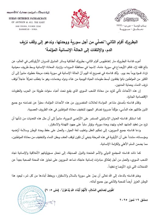 Su Santidad el Patriarca Mor Ignacio Efrén II, Patriarca de la Iglesia Siriana Ortodoxa de Antioquía y de todo el Oriente, expresó su profunda preocupación por el deterioro de la situación en Siria en general, y en particular en la provincia de Suwayda, así como por el aumento del sufrimiento humanitario en medio de condiciones de vida que se agravan día a día.